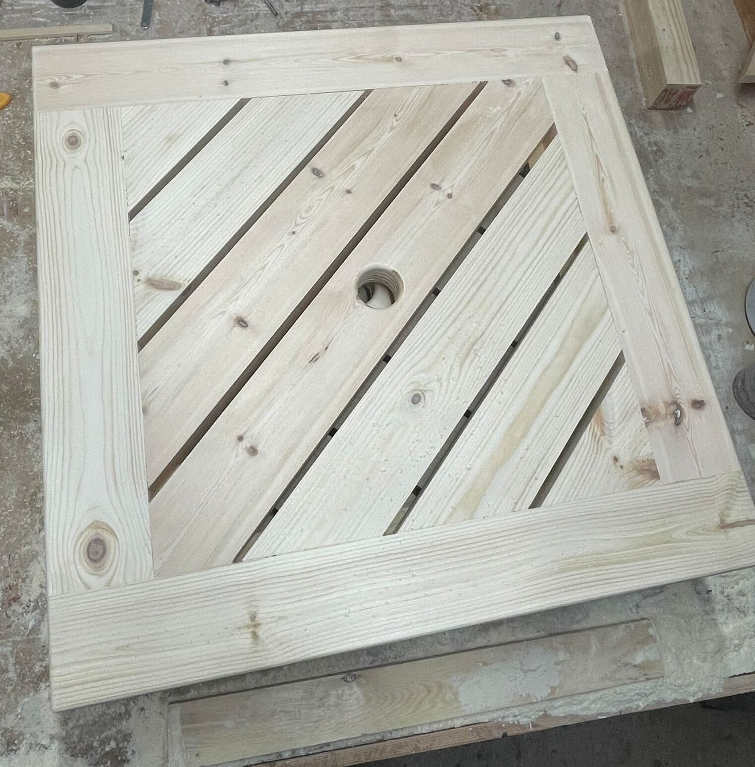 A local business in Ely needed four outdoor table tops with umbrella holes, sized specifically to fit bases they already had. We made the tops from softwood (pine), a durable, affordable and easy-to-maintain material for outdoor use.